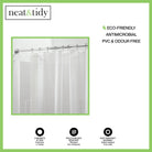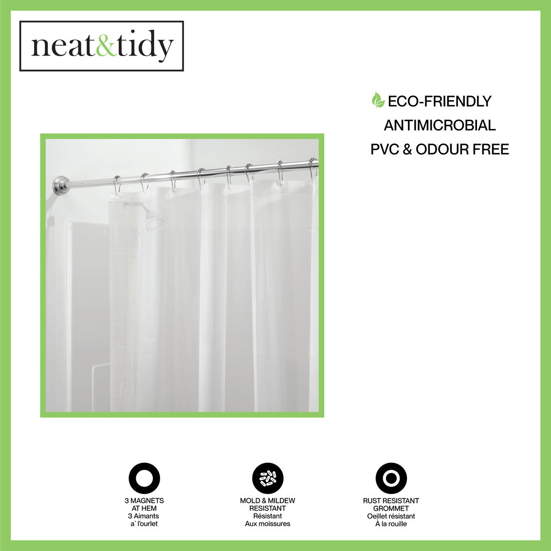 Upgrade your shower experience with our high-quality neat&tidy shower liner. Crafted from a blend of 70% PEVA and 30% EVA. The rust-resistant grommets ensure easy installation, while the chlorine and odor-free composition guarantees a refreshing shower. With mold and mildew resistance, your liner will stay clean and hygienic. Plus, the three magnets at the hem keep it securely in place.