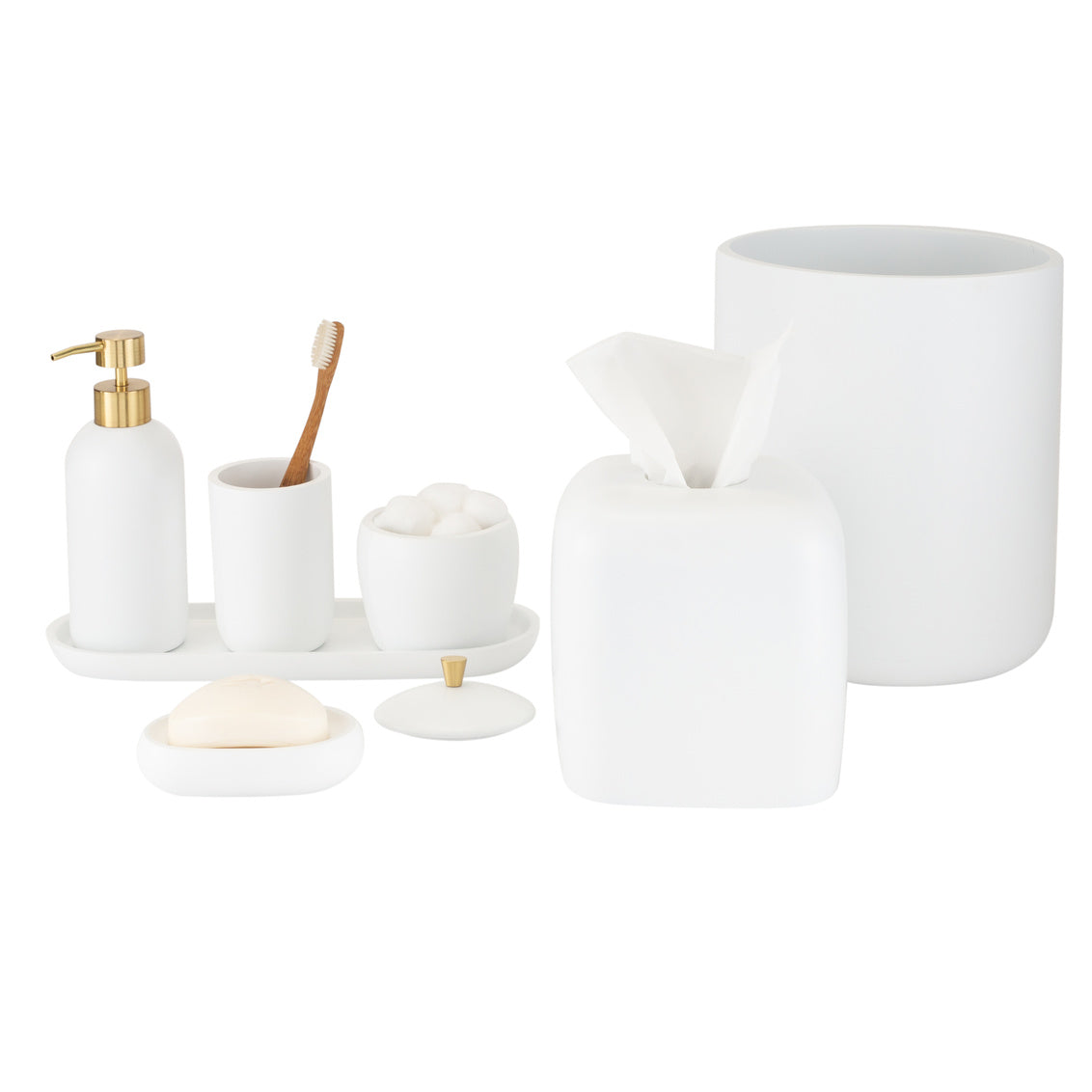Introducing the Sophia Bathroom Accessories Set, a harmonious blend of softness and contemporary flair. This collection seamlessly marries gentle curves with modern design elements, creating a balance that is both soft and rigorously modern. The soft shoulders of the set are adorned with tasteful gold accents on the soap pump and cotton jar, lending an artistic touch reminiscent of the Art Deco era. The pieces are elegantly finished in an understated all-white hue, enhancing the modern aesthetic. Comprising seven unique pieces, each sold individually, the Sophia collection allows you to curate your own personalized bathroom ensemble. The lotion pump, with a generous 280 ml capacity, adds both functionality and style to your daily routine. Elevate your bathroom decor with the sophistication of the Sophia Bathroom Accessories Set, where modernity and timeless elegance coalesce in a design that speaks to both luxury and practicality.