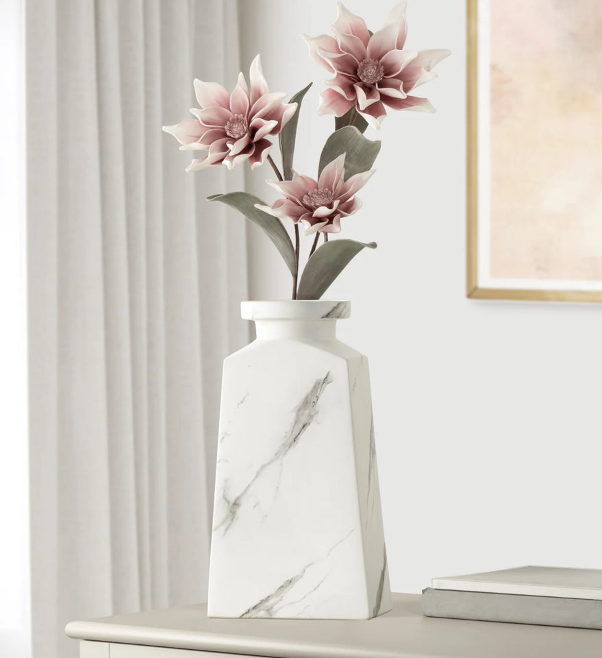 Add drama and beauty to your space with this stylish marble patterned ceramic vase. With a unique tapered shape, this decorative accent is perfect for fresh or faux florals, or as a standalone sculptural piece. Place on a shelf or use on table to create a dynamic centerpiece.
