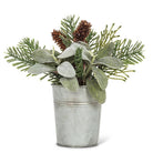 Add a natural holiday accent just about anywhere with this Pine Branch Greenery in Bucket. Crafted out of plastic and metal, this life-like pine branch with pinecones and pine sprigs comes in a rustic metal bucket for an elegant way to bring a touch of greenery to your holiday decor.