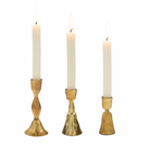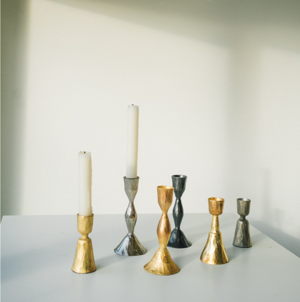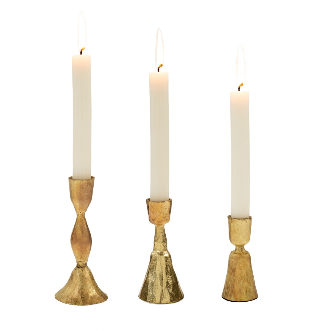 Designed to bring light and luxury, the Zora Forged Candlesticks have a gold finish and are faceted, not smooth, simple, and understated. They bring a sense of occasion and celebration to everyday evenings and complete tablescapes and mantels alike.