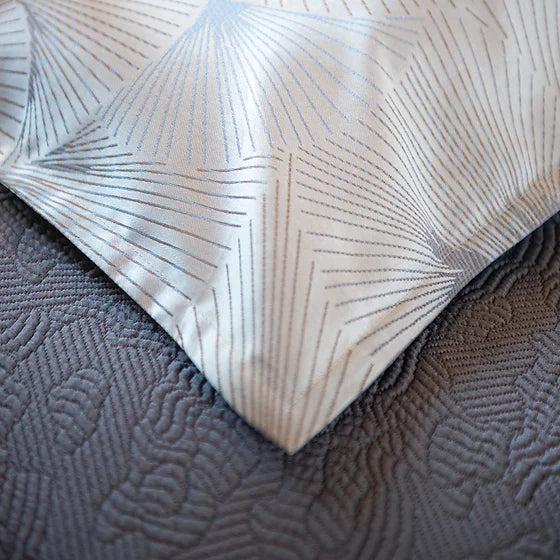 Embrace your inner glam with Fitzgerald’s deco-inspired design. Fitzgerald features waves of fan detail in slate, taupe, and caramel on a pewter backdrop. This intricate jacquard pattern is masterfully woven into a luxuriously soft sateen using the finest 100% Giza Egyptian extra-long staple cotton. Fitzgerald delivers the brilliance of the Jazz Age with its luxe modern neutrals, curve detail, and streamlined finishing.