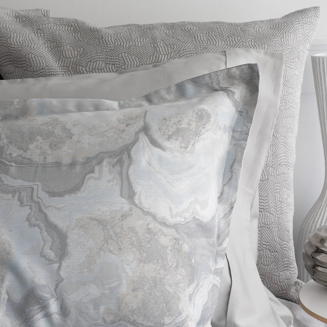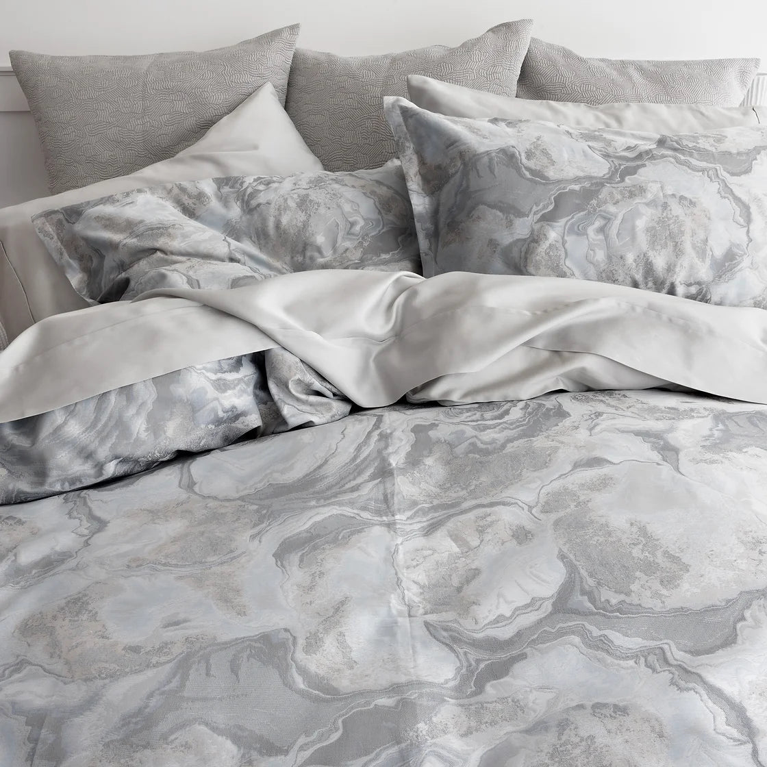 The magnificent work of creating a moiré effect throughout this exquisite jacquard is only possible with Italian craftsmanship's expertise. Like cutting through malachite stone, Opus features an undulated pattern of rippled figures shaded by tones of blue, taupe and grey. A perfect balance of visual interest and craftsmanship, Opus features a rhythmic cross-section of nature-inspired shades that cascade throughout, making it the most opulent of luxuries.