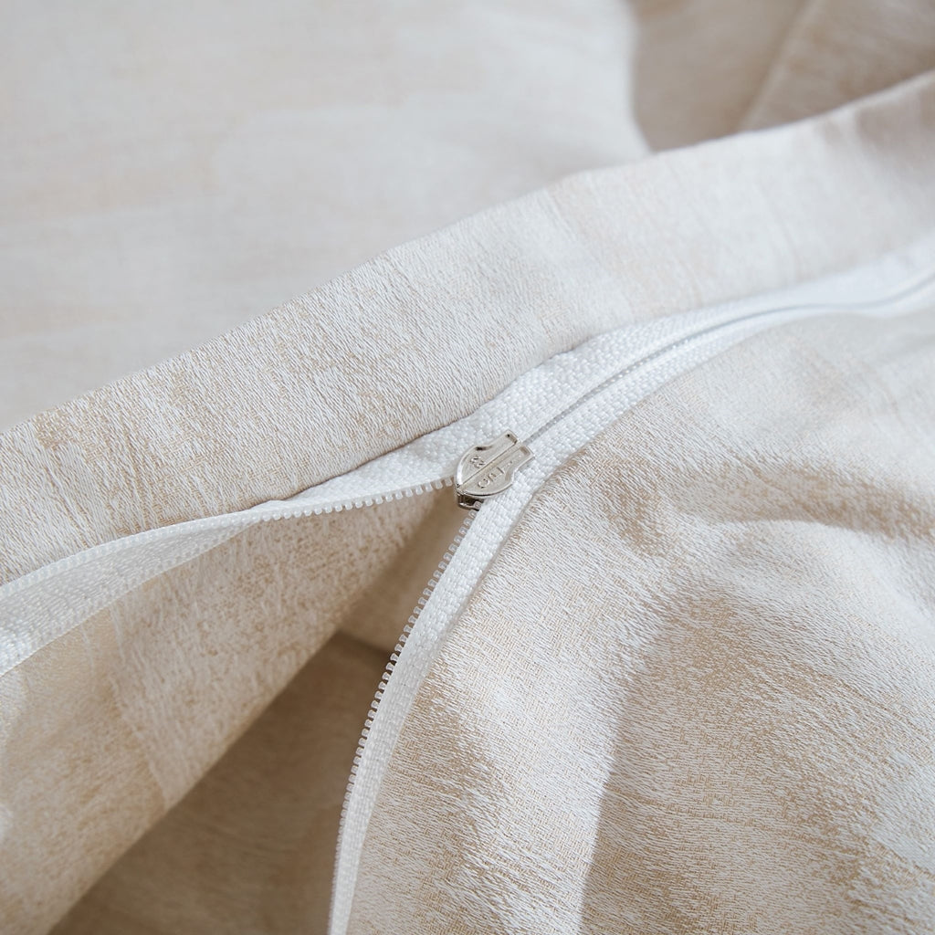 Palma is an exquisite yarn-dyed jacquard duvet cover and sham set combining mocha and soothing cream shades. It boasts a modern and warm aesthetic that brings a touch of luxury to your home. Crafted with care in Portugal, the fabric boasts a high thread count of 280, ensuring both softness and durability.