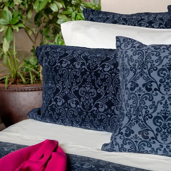 Royce creates a mood that is both bold and enticing. The intense navy colour exudes strength and confidence, while the rick, soft texture invites you to curl up on a cold day. Fine long staple cotton and viscose are woven to create an artisanal jacquard chenille that is ultrasoft and substantial. Royce can make a big statement or be the perfect accent in the bedroom or living room.