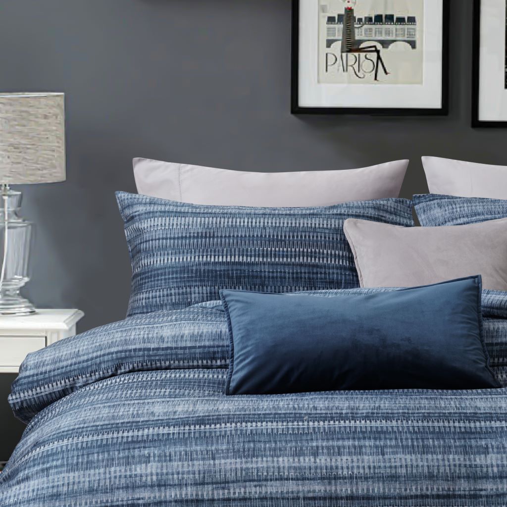 Enjoy the tonal effects of blues and soft greys with our texturally printed Ethan duvet cover set. This cover and pillowcase set depicts a neutral unisex design that works well with a modern, clean aesthetic. Printed on a 300 count combed cotton sateen, this cover set is both soft and breathable providing natural comfort. It is both machine washable and dryable for ease of care. The cover has a 60” hidden zipper opening along one side and is oversized to account for residual shrinkage.