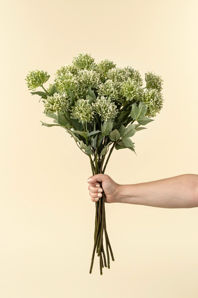 Add natural charm to your space with the Sedum Spray in Green, a versatile accent decor element that brings texture and life to styled vases. With soft, lifelike leaves and fresh green florals, this long-lasting faux botanical is perfect for mixing with other stems or displaying solo for a minimalist look.