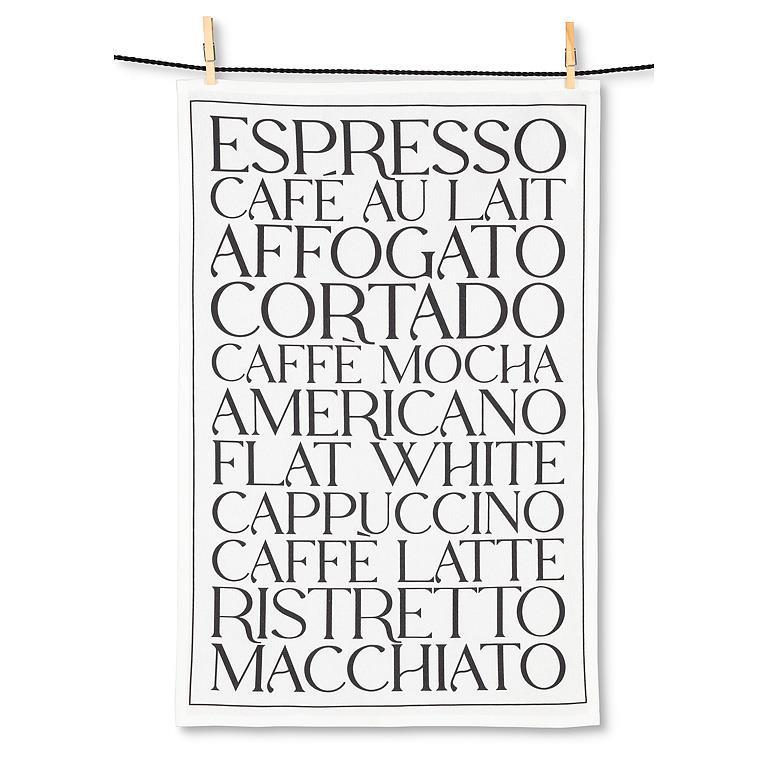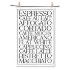 Keep your dishes dry, and your kitchen tidy with our Abbott designed Coffee Types Text Kitchen Towel featuring lots of coffee beverages, a charming and whimsical addition to your kitchen decor. Made in India, this tea towel is adorned with a great list of your barista's favorites. Made from high-quality fabric, it offers both style and functionality, making it the perfect accessory for drying dishes or adding a festive touch to your kitchen decor.