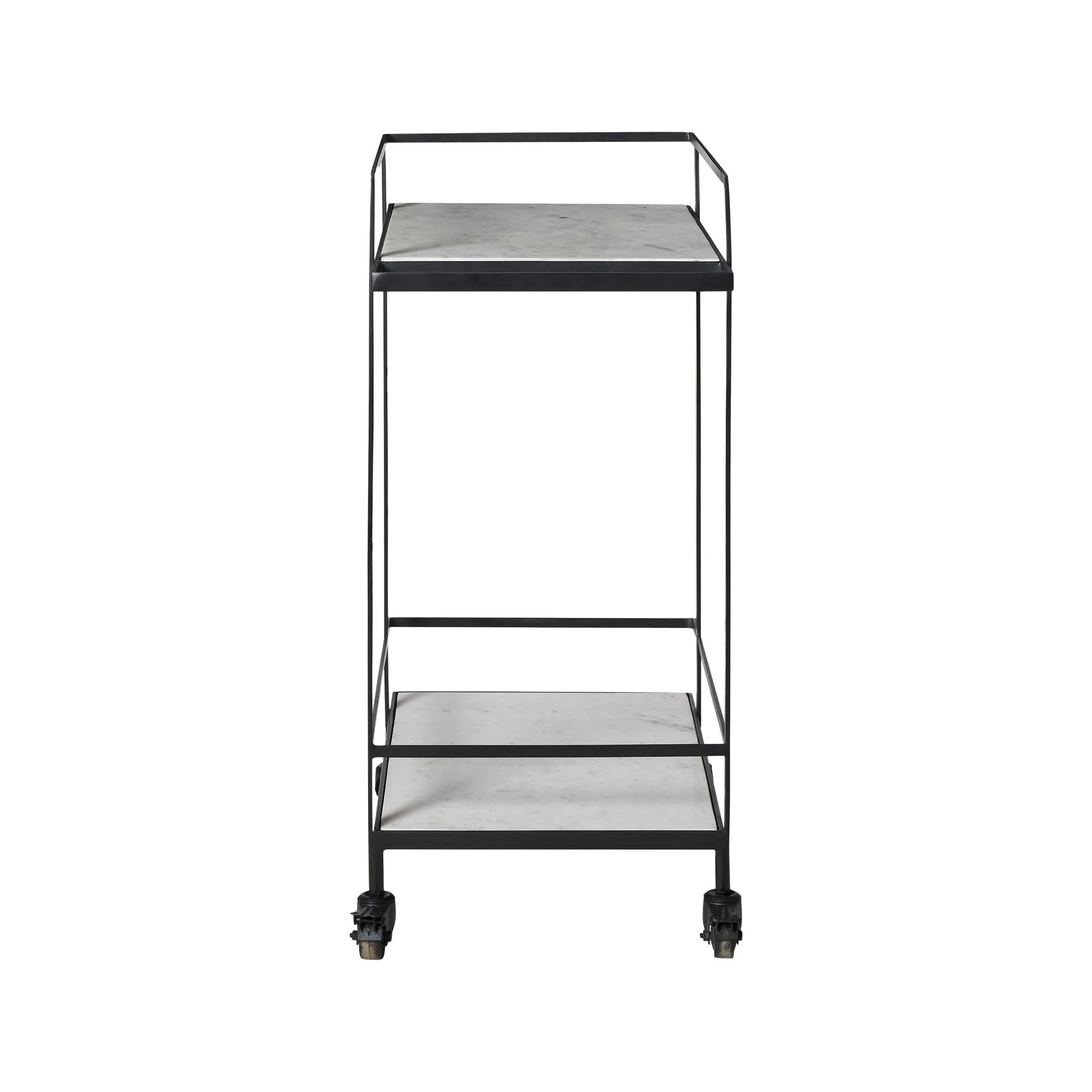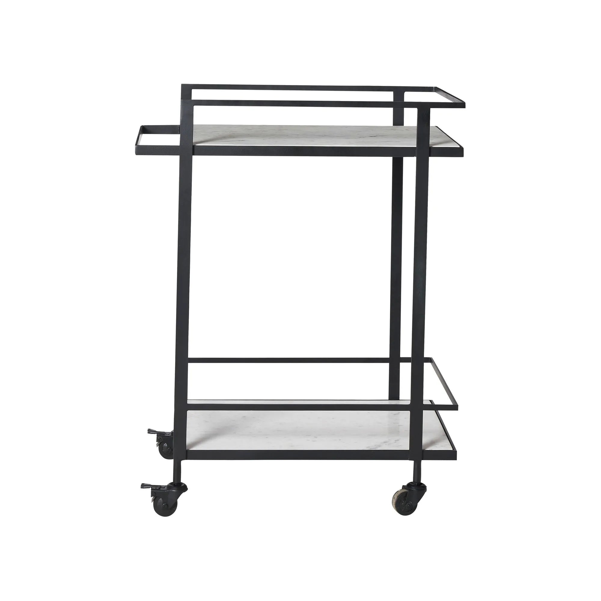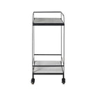 Get ready to roll this accent bar table into any room and start creating cocktails like a pro. Luxurious white Banswara marble meets dark and dramatic black cast aluminum to deliver a bar cart that’s ready for happy hour. Its wheeled construction allows users to move the cart freely from room to room. Mix cocktails and pour wine from the top tier and stash all your spirits and glasses down below. Anywhere its set up, there’s sure to be plenty of space for all your cocktail needs.