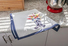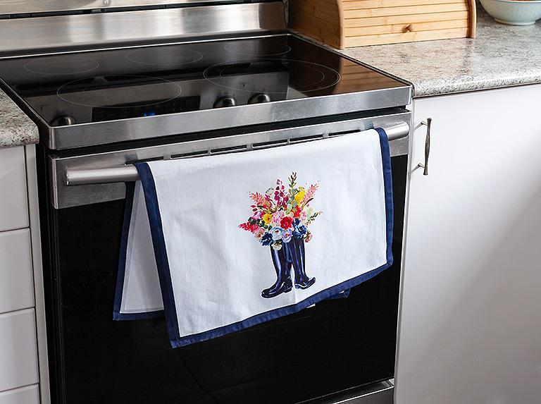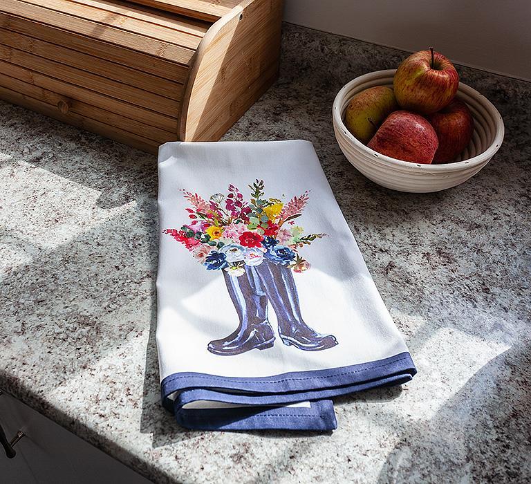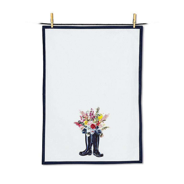 This Flower & Rubber Boots kitchen towel makes an elegantly simple complement to any kitchen. An Abbott Exclusive, this 100% cotton white kitchen towel is accented with a navy-blue border to highlight the beautifully painted, watercolor-style bouquet spilling out of classic black galoshes.