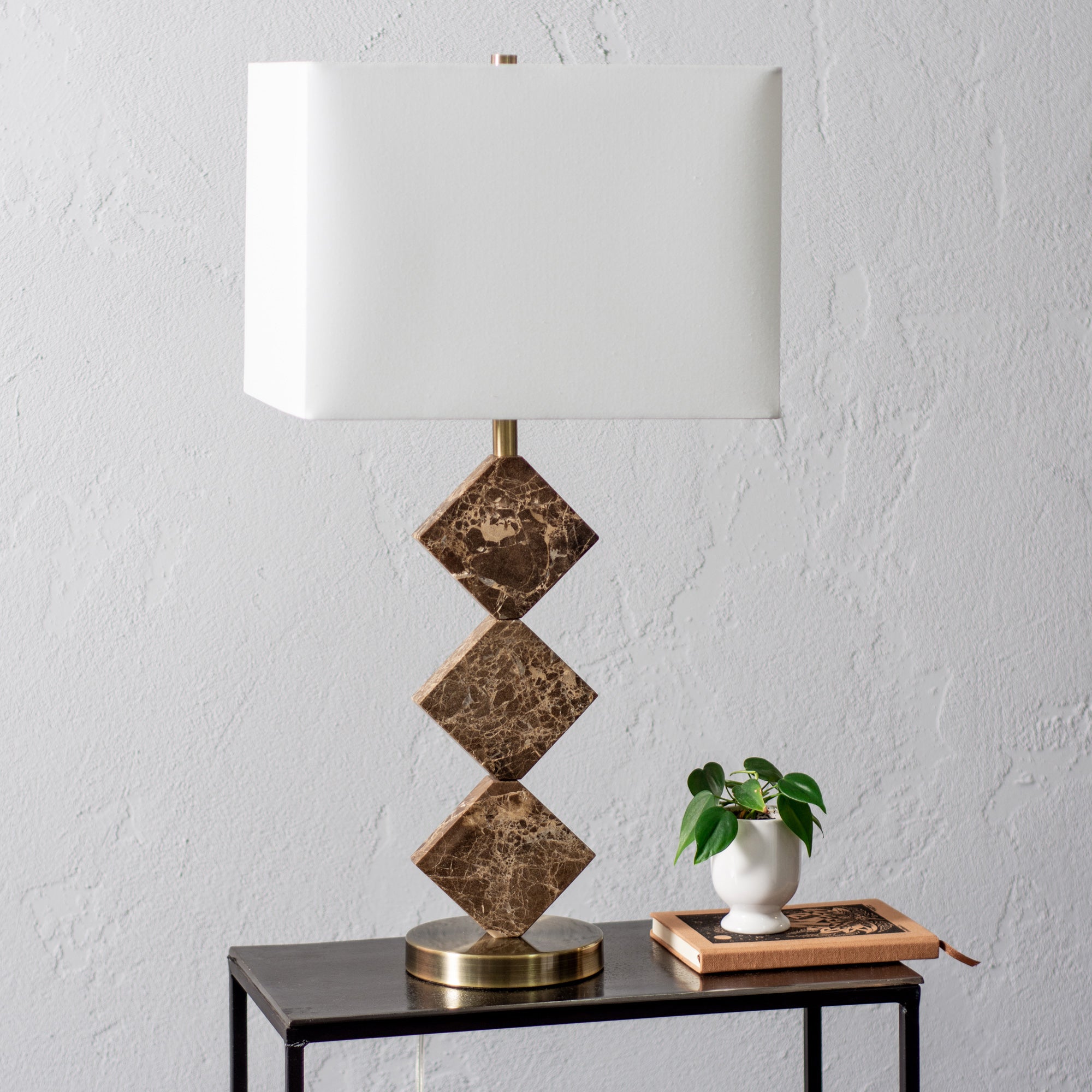 Table Lamp - Brown Marble- Iron - Satin Brass Plated - Finish - Off-White Cotton Shade - 3-Way Switch - Max. 100W - E26 Socket