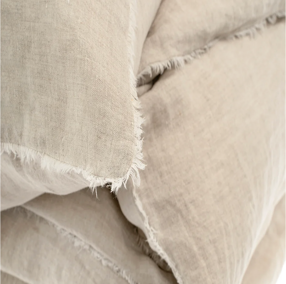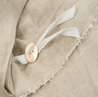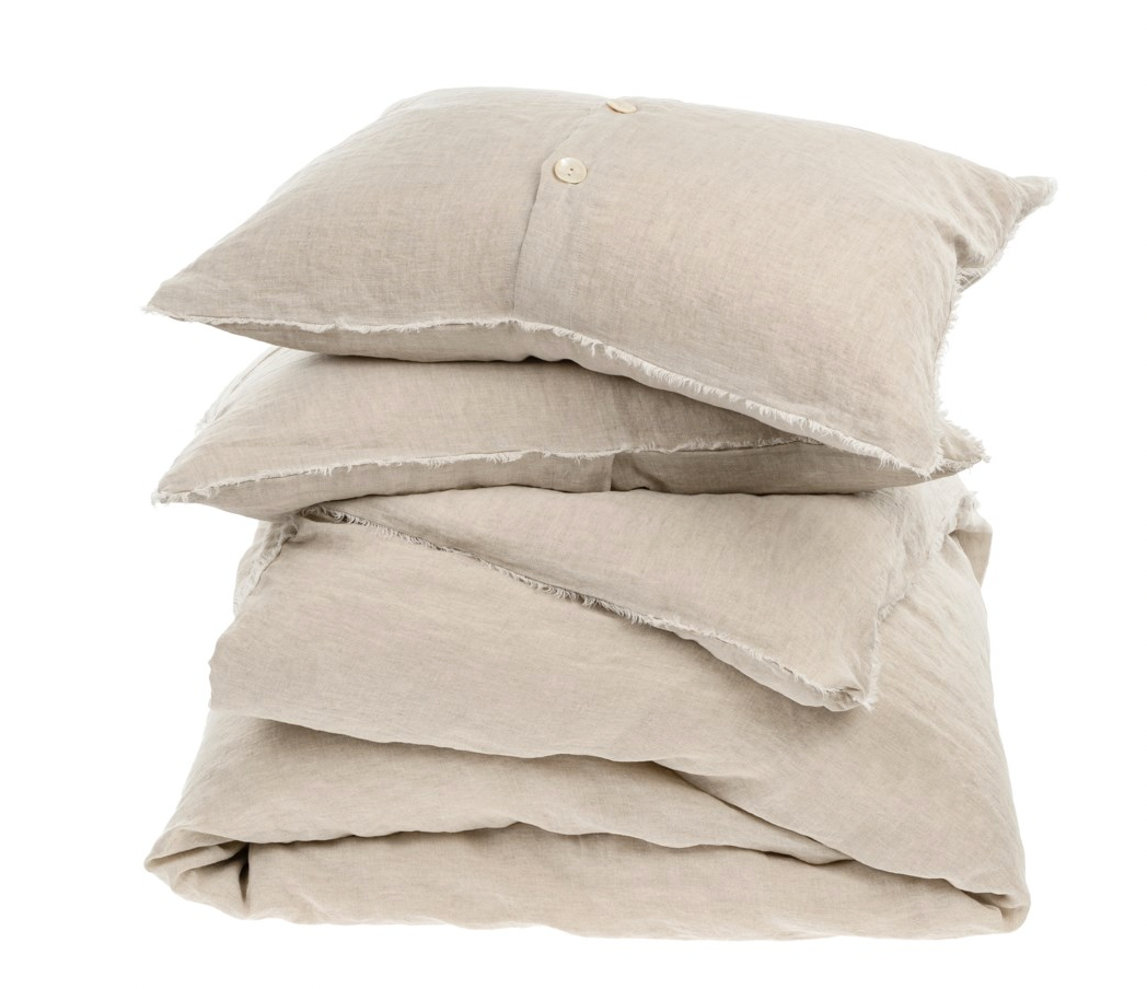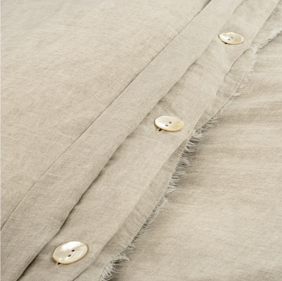 They are pre-washed for softness, durability, and relaxed feel. Each set includes one Queen duvet cover and two Queen pillow cases and features include frayed edge, mother of pearl button closure at edge of duvet cover and back of pillowcases, internal ties, and spare button.