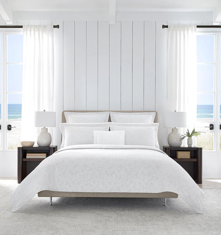 Aldino’s dappled texture is created by overlaying an abstract sateen weave pattern over a linear background—realizing a dreamy surface reminiscent of the glistening waters flowing through rocky, mountain creeks.
