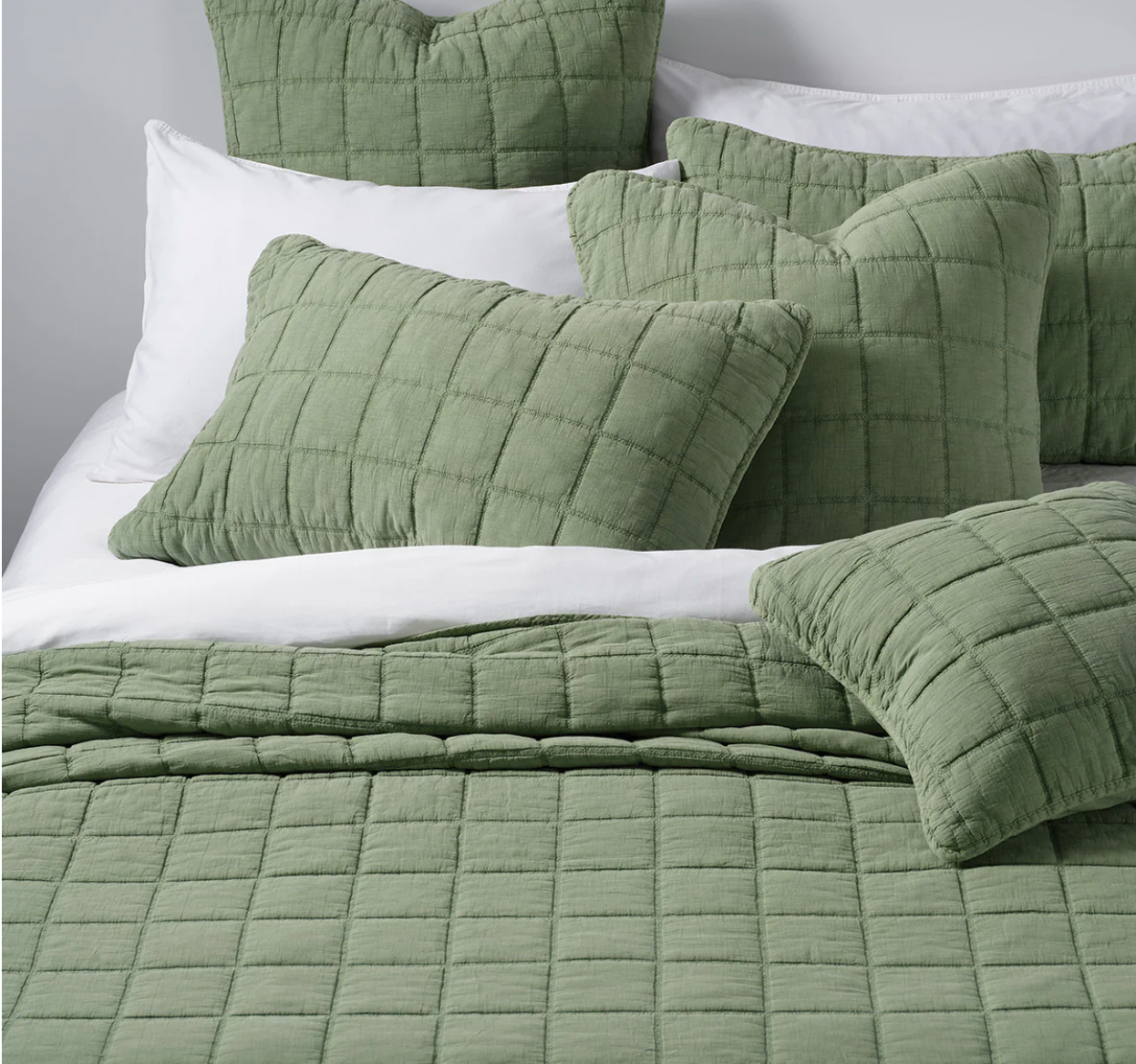 - Green colour quilt with a stitched plaid