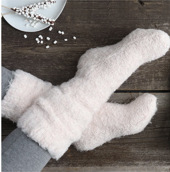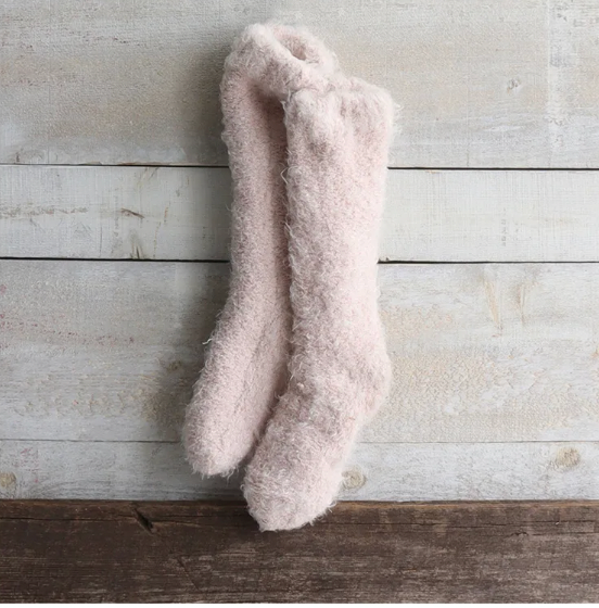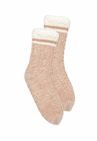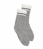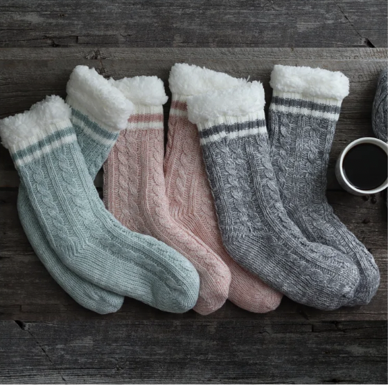 KOZIE AS YOUR FAVORITE BLANKET THESE LOUNGE SOCKS HAVE A SWEATER-LIKE KNIT EXTERIOR ARE SUPER SOFT AND PLUSH ON THE INSIDE. THEY FEATURE NON-SLIP BOTTOMS. ONE SIZE FITS MOST