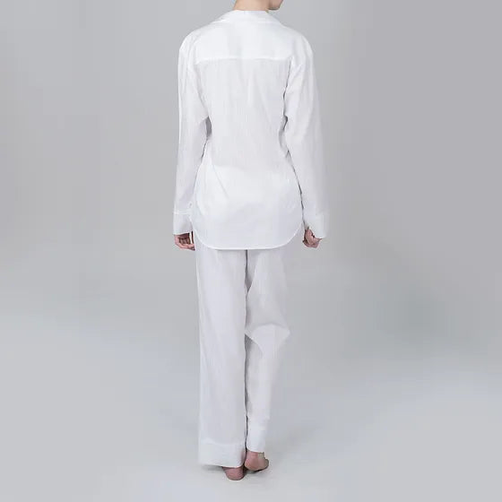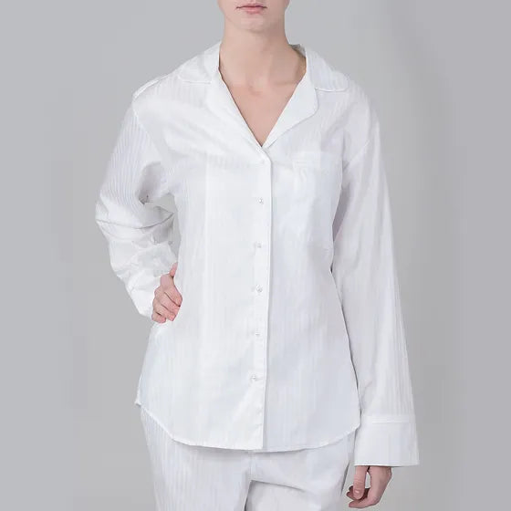 The Pavia shirt is a classically styled sleep shirt, adorned with narrow white stripes. The lined back yoke hides the shoulder seems, which makes it more comfortable. Pavia features beautiful trim detailing that gives it a polished look. Shown with the Lucca pants.