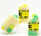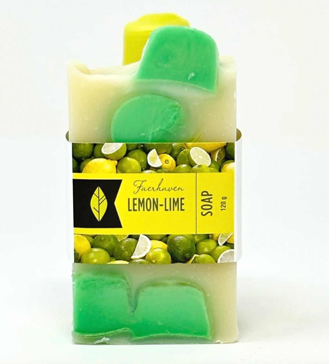 INGREDIENTS: Sodium olivate, Sodium cocoate, Vitis vinifera, Butyrospermum parkii. Citrus limon & Citrus aurantifolia. Mica. (Saponified oils of Olive, Coconut, and Grapeseed. Shea Butter. Lemon and Lime essential oils. Green and yellow mica.)