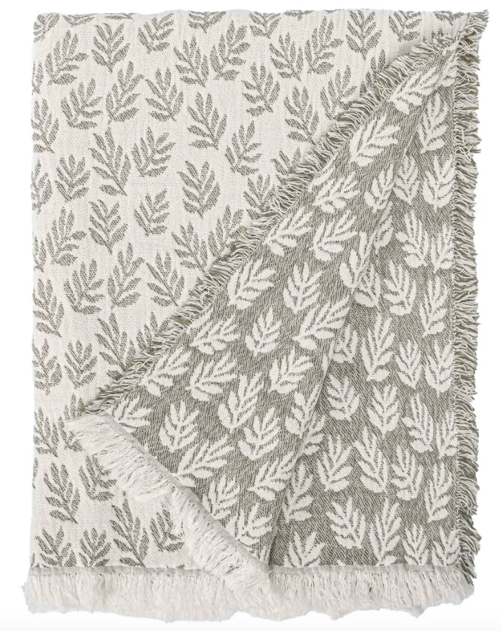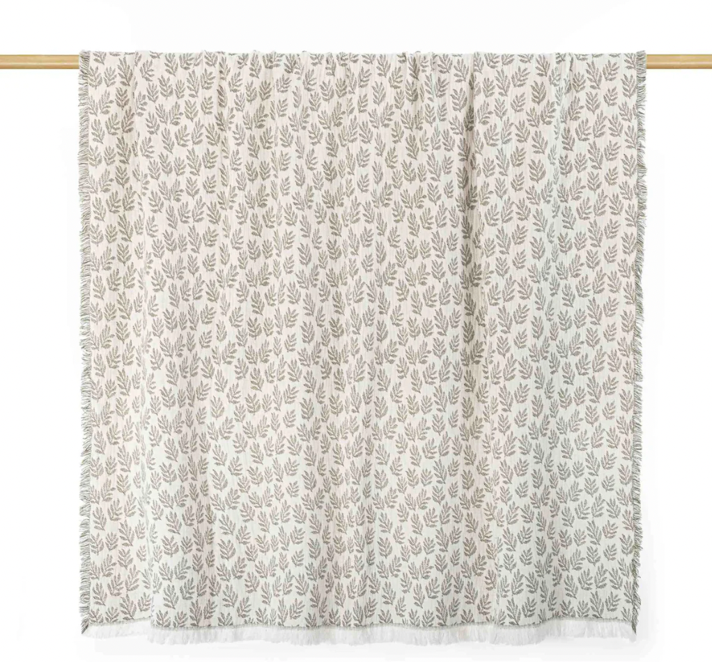 Our Sprig throw from Portugal is crafted from 100% cotton, offering both durability and design. Featuring a woven leaf pattern, it brings a natural, elegant touch to any space. This reversible design showcases two looks in one combining cream and a deep moss green. Finished with a fringe edge, the Sprig throw adds texture and charm whether draped over a sofa or layered on a bed.
