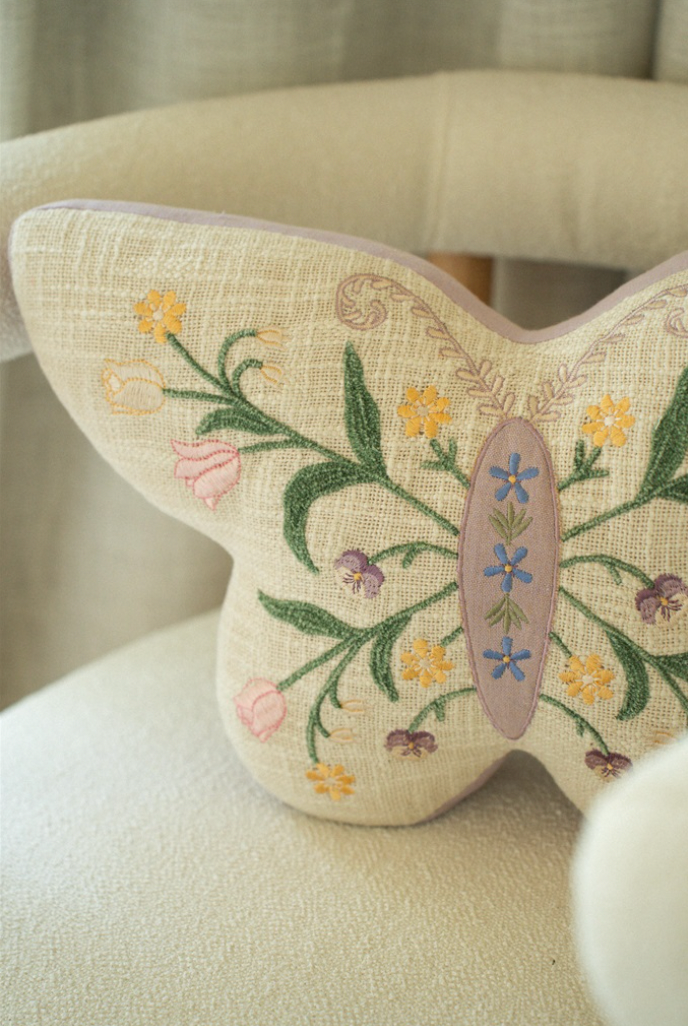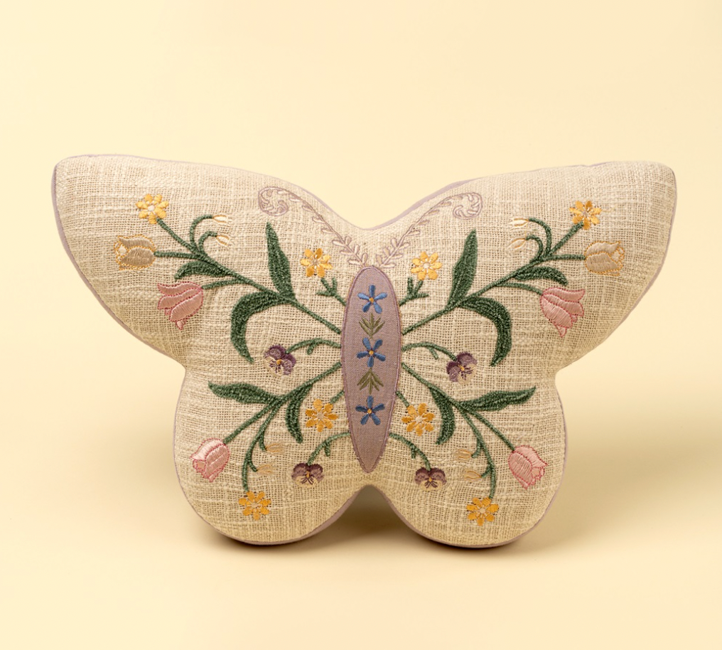 Sweetly shaped and delicately detailed, this butterfly pillow brings a playful touch of nature indoors. Its sculptural form captures the grace of a butterfly, while intricate floral embroidery adds colour, texture, and artisan appeal. Equal parts whimsical and cozy, it’s a piece that invites both comfort and delight.
