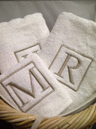A plush white bath towel embroidered with a boxed monogram in a satin camel thread colour.