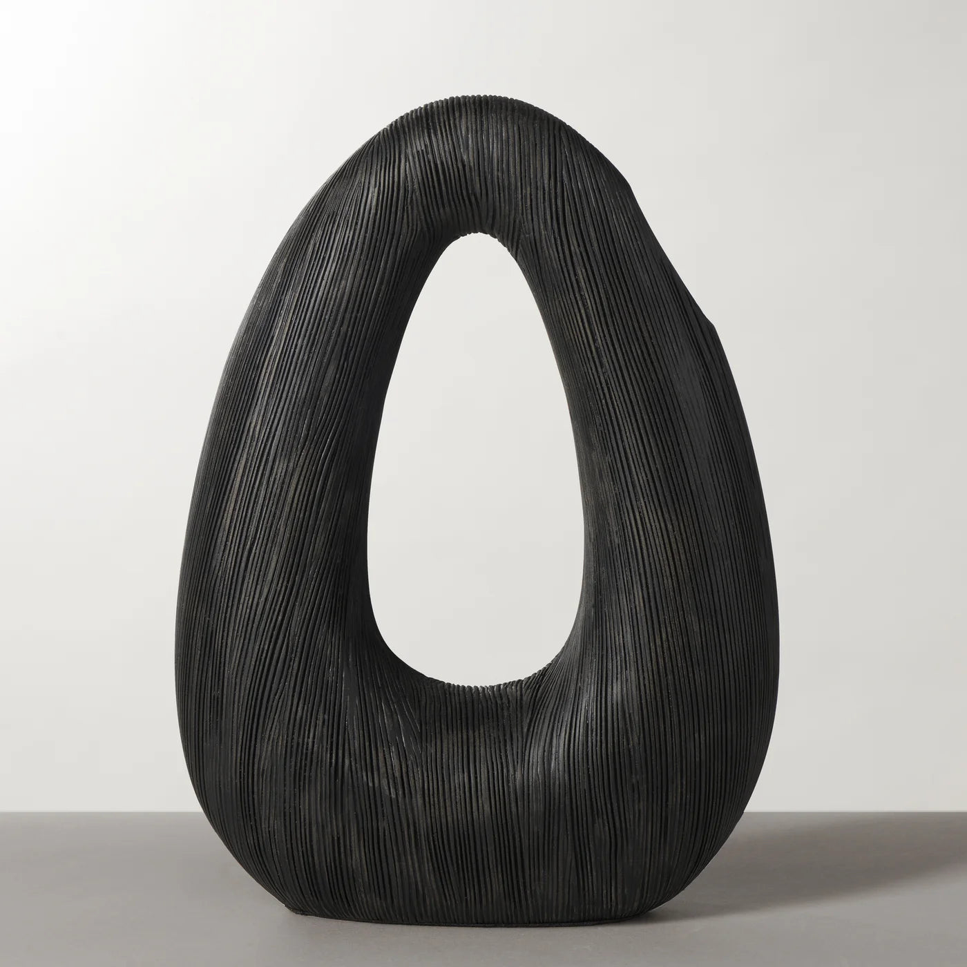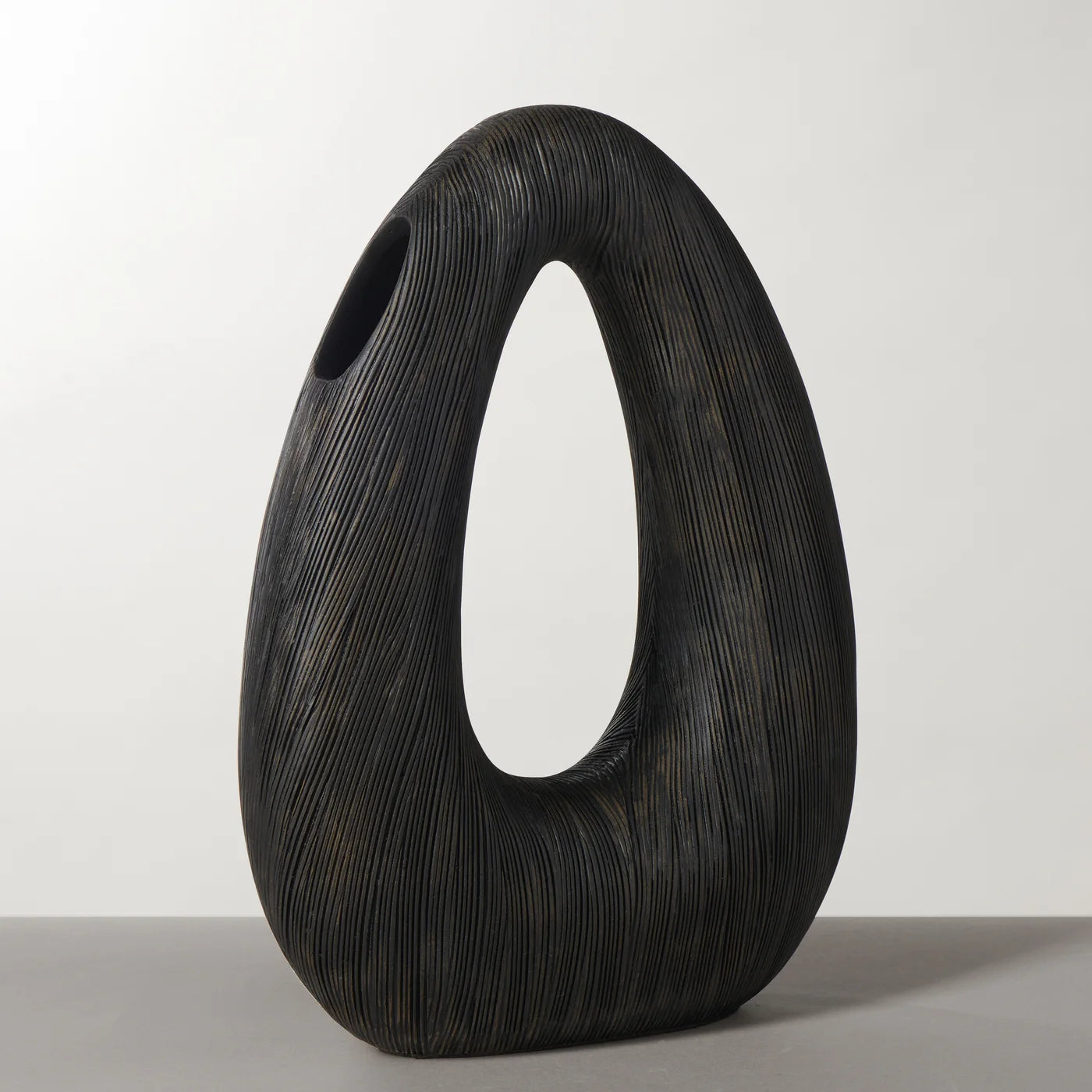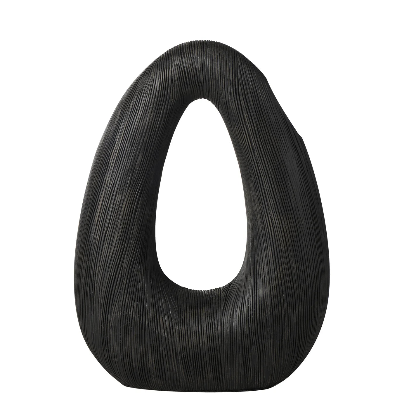 With its distinctive modern design, our donut-shaped vase boasts a unique black patina that adds an inviting touch to any space. This unique piece stands out as a contemporary decor highlight, making a stylish statement without compromising functionality. Its eye-catching silhouette and rich color make it an ideal centerpiece, effortlessly infusing a sense of modern flair into your home.