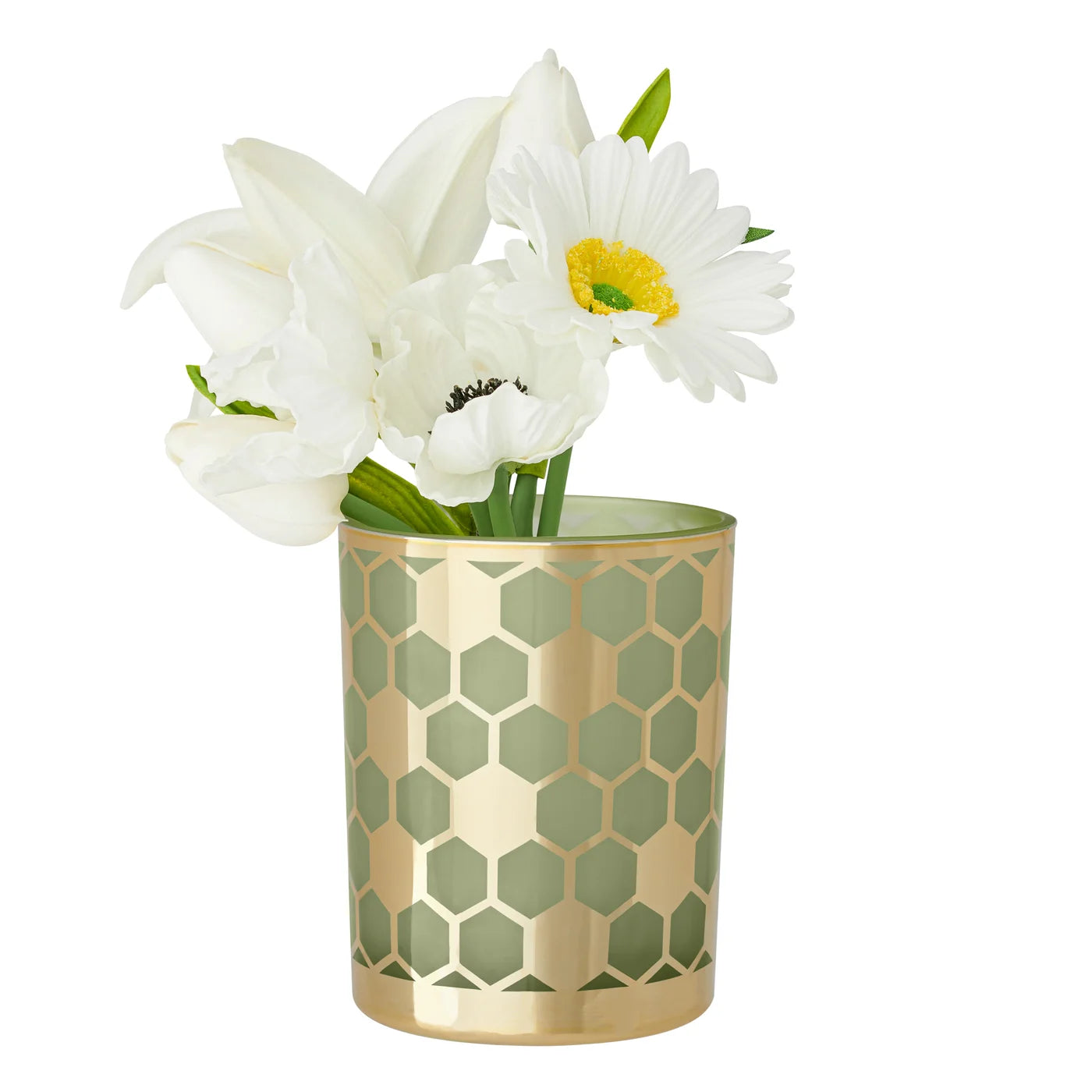 Whether used as a small vase or as a candle holder, this glass hurricane will standout in any space. The light green glass pairs perfectly with the gold honeycomb design giving this piece a modern lux appeal.