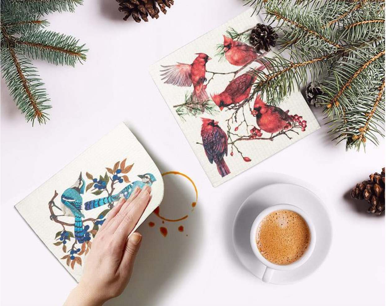 These biodegradable European-made and PRC-printed dishcloths are as durable as they are eco-friendly — featuring a detailed image of cardinals. Our digitally printed dishcloths will help with your washing and cleaning. Ultra-absorbent, each machine-washable cloth replaces up to 15 rolls of paper towel, and lasts for up to 12 months. Perfect for the home, office or cottage. Exclusive to Abbott. Many styles available.