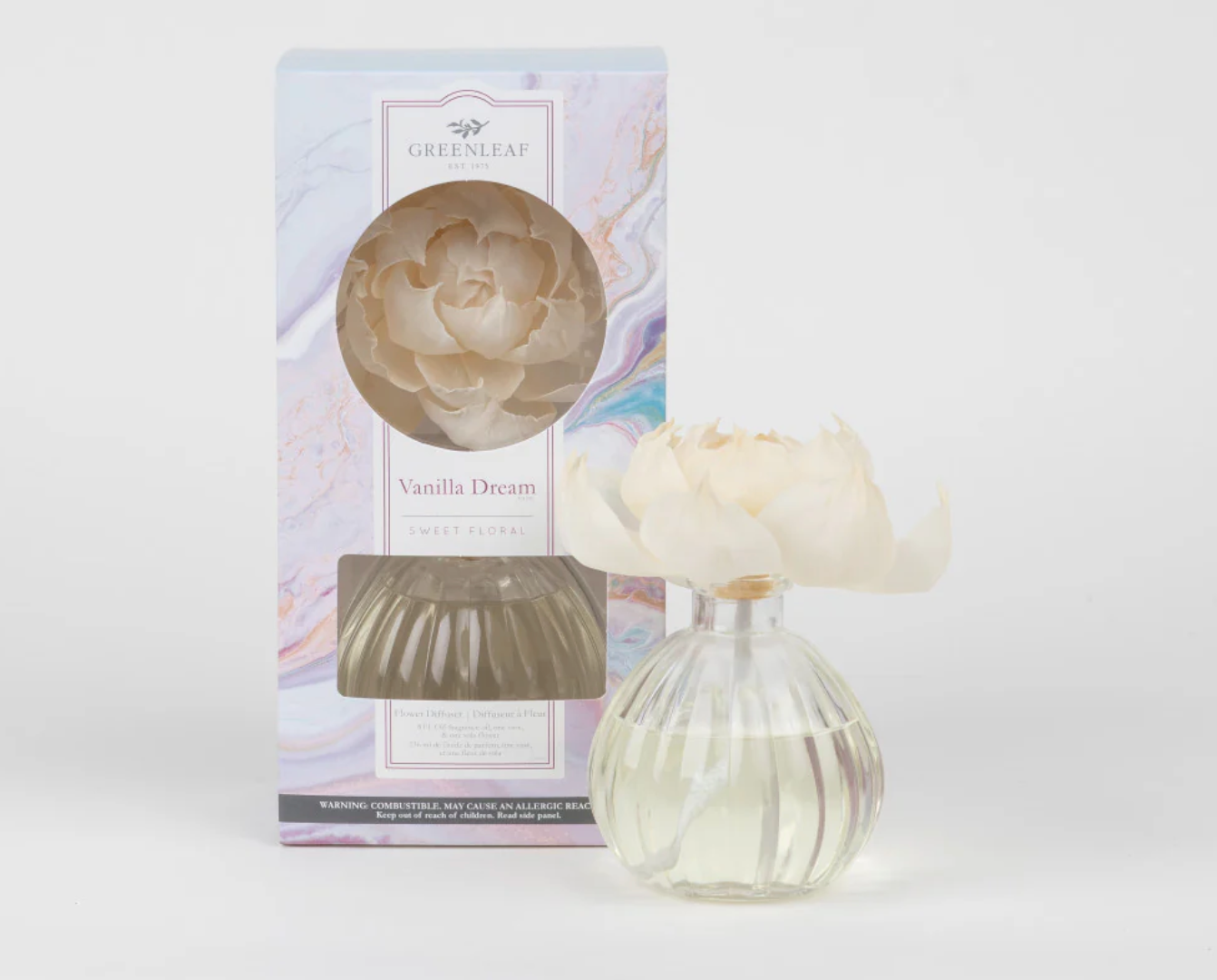 Our Flower Diffuser includes your favorite Greenleaf fragrance oil and a sola paper flower that emits a beautiful, blooming scent for up to 60 days! As the fragrance oils are absorbed through the wick, the flower begins to “bloom,” slowly emitting the fragrance and eventually resembling real flower petals. With the neutral color of the oil and the large flower, it will enhance and complement any space.