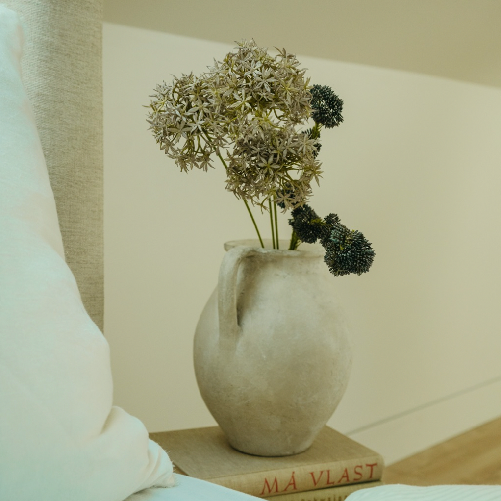 The uniquely textured Rhodes Pitcher Vase has an overall sense of artisanal, unique quality and takes its cues from antique forms. Grand in scale, we style it to emphasise its drama and add dried flowers or pampas grass. Terracotta is porous by nature. To minimize perspiration, we recommend using a watertight vessel inside when styling with fresh flowers or display with our faux florals.