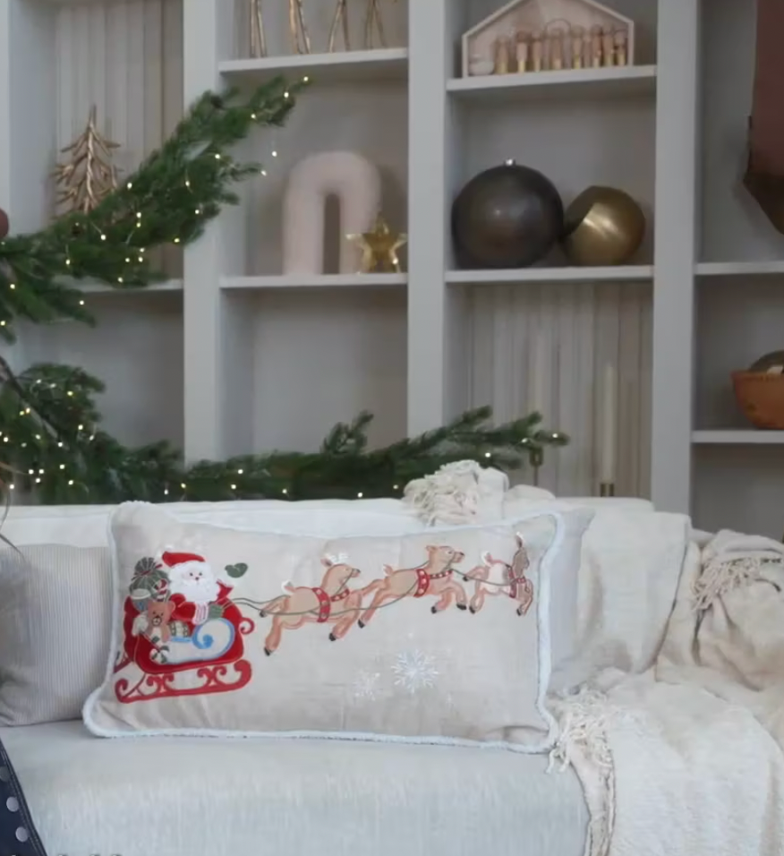 Bring holiday magic to any space with our Santa’s Sleigh Cushion! This 14” x 24” cushion features a natural-toned fabric base with an embroidered design of Santa in his sleigh, pulled by reindeer amidst falling snowflakes, creating a festive scene. Part of a coordinated collection with a matching table runner and a 54” round tree skirt, it’s perfect for retailers or home decor suppliers looking to offer a joyful seasonal set.
