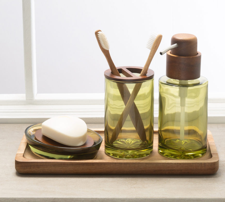 Introduce the Acacia wood and heavy cast glass Vaso series, featuring a clean and natural look that seamlessly fits into any bath environment aiming to utilize all-natural materials. This simple line consists of three essential pieces: the lotion pump, soap dish, and toothbrush holder. To achieve a complete look, pair this series with the Madera Acacia tray. The combination not only enhances functionality but also brings together a cohesive and welcoming atmosphere. Experience the beauty of natural materials with the Vaso series, bringing timeless simplicity to your bath space.