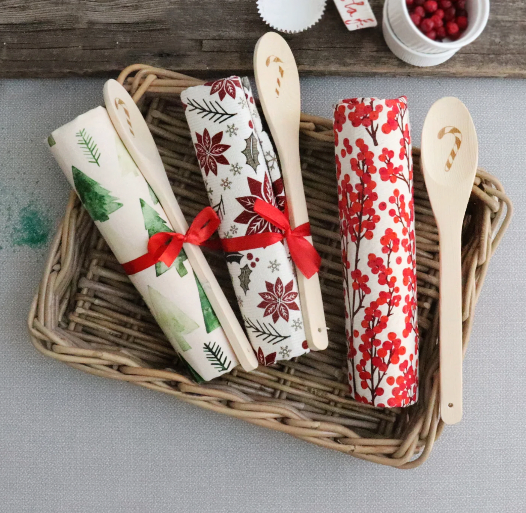 BRING A FESTIVE TOUCH TO YOUR KITCHEN OR GIFTING WITH THESE TEA TOWEL AND WOODEN SPOON SETS. MADE OF COTTON ,EACH SET INCLUDES A STYLISH WOODEN SPOON, MAKING IT A PERFECT GIFT IDEA FOR THE SEASON.